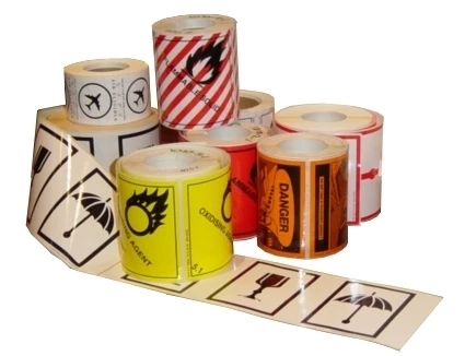 Etiketter: Vi har etiketter med alle advarselssymboler og alle typer af fareklassesymboler i forbindelse med farligt gods emballage.